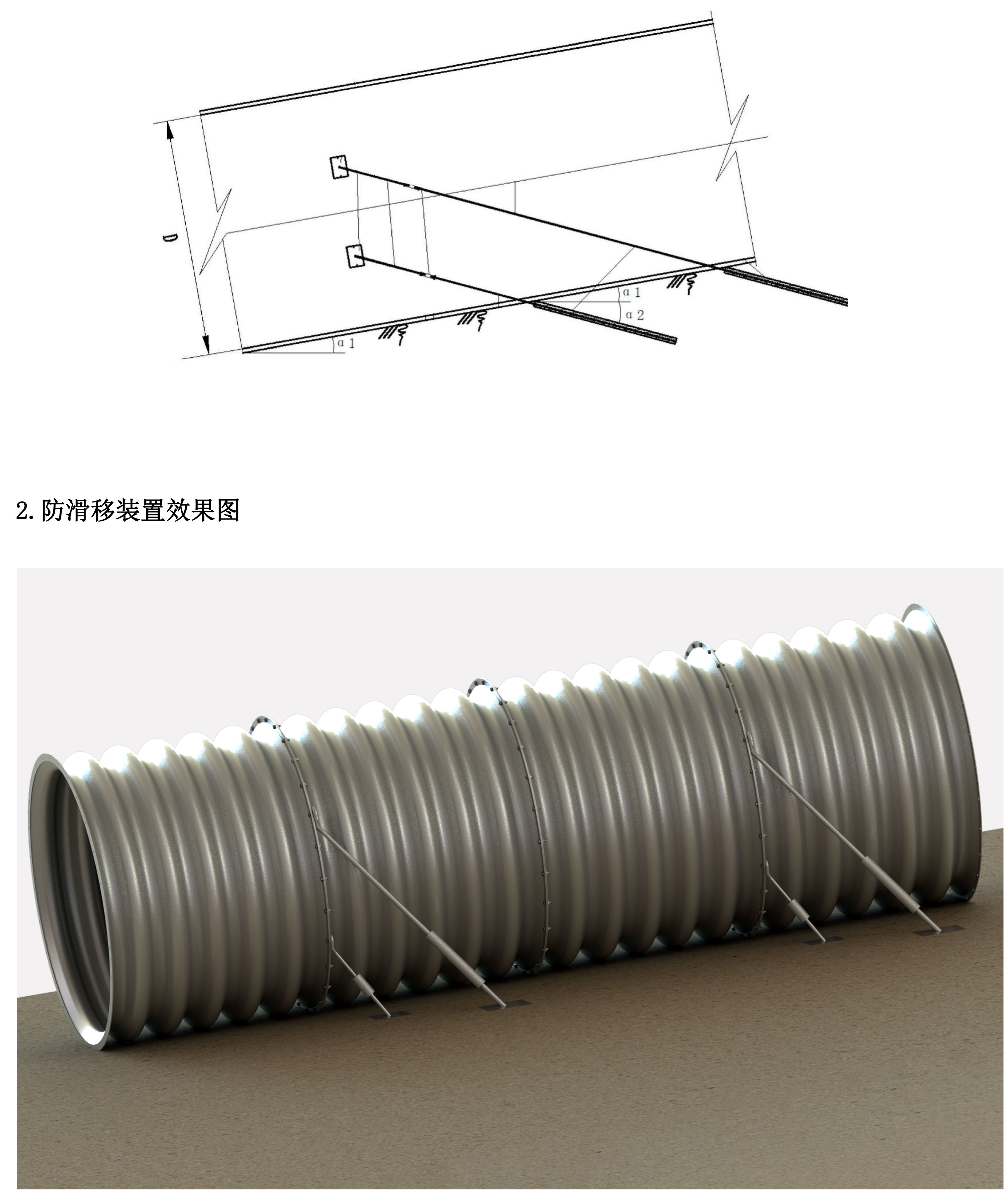 三、陡坡地形波紋鋼管道防滑移裝置示意圖及效果圖